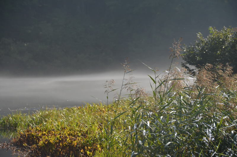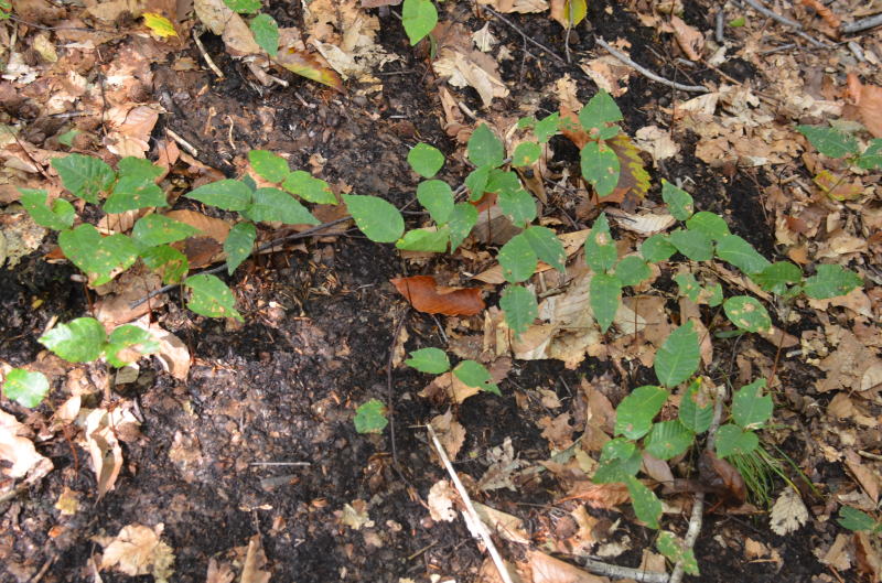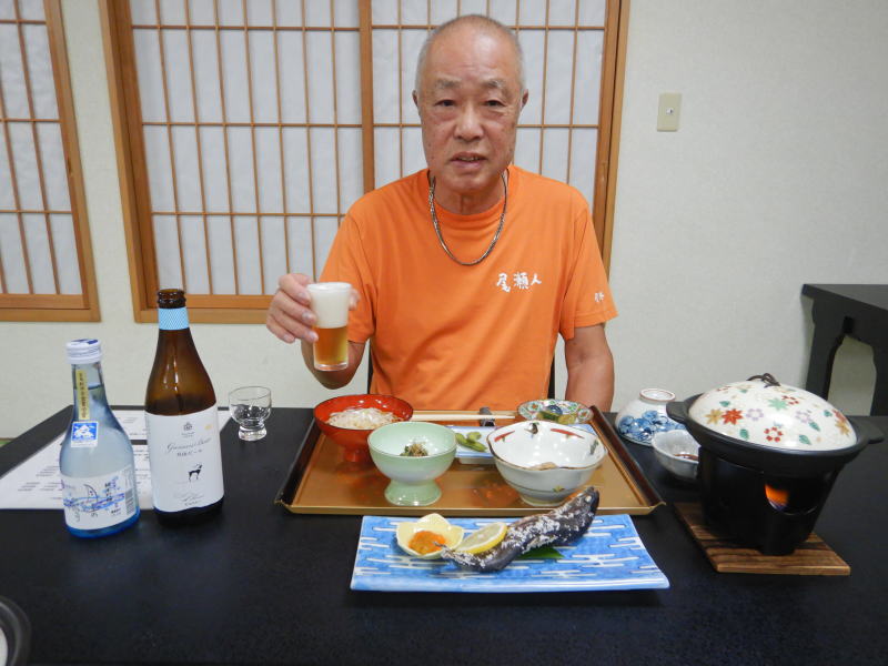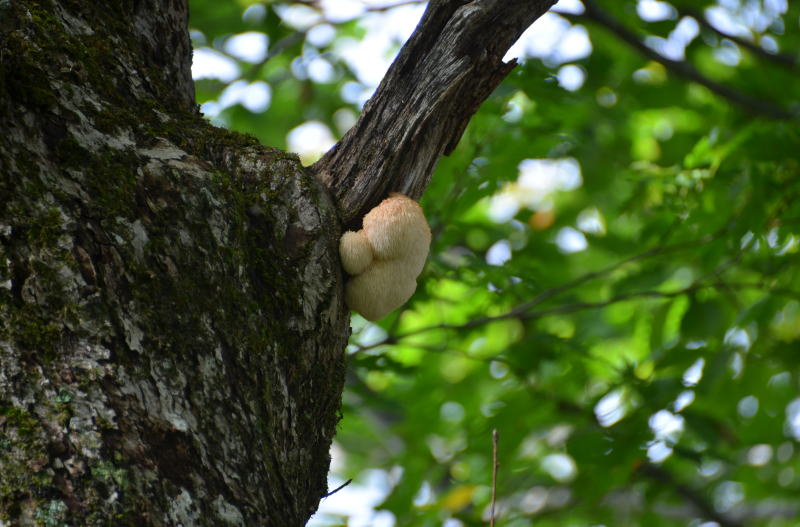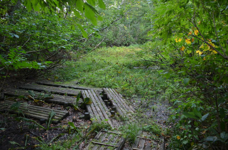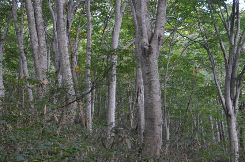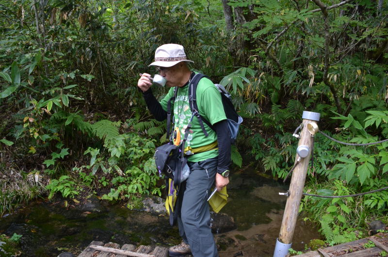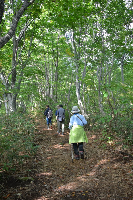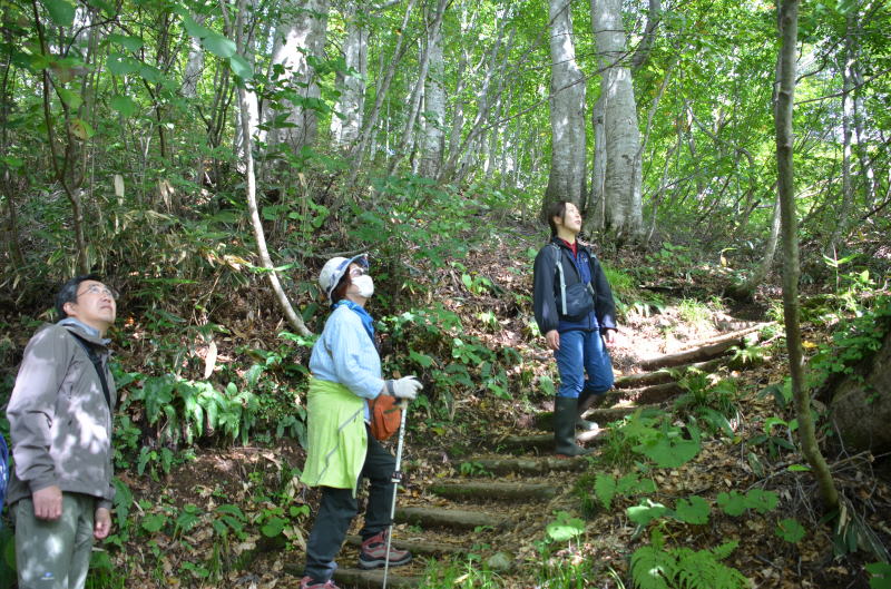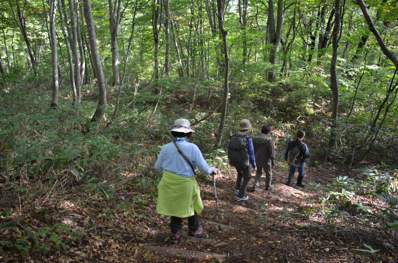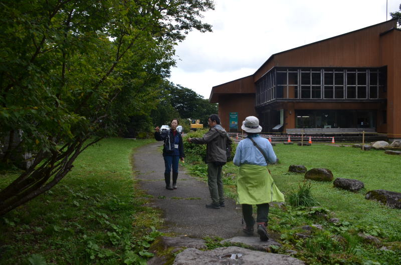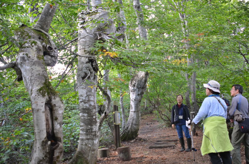 山形自動車道西川ICで下車し、途中西川道の駅で昼食を取ったのち、志津温泉五色亭でのチェックインまで時間があったため月山ネイチャーセンターに立ち寄りました。丁度13時30分より無料のガイドウォーキングがあったため参加しました。以前に5月の残雪期に歩きましたが、ブナ二次林コースからミズナラの尾根、湿地帯、湧水地、ブナ原生林のコースを1時間程度の説明を受け歩きました。今年の夏は雨が殆ど降らず、尾根筋の樹木が枯れたり、どんぐりや山ぶどう、アケビなどの実が殆ど付かなかったそうです。 |