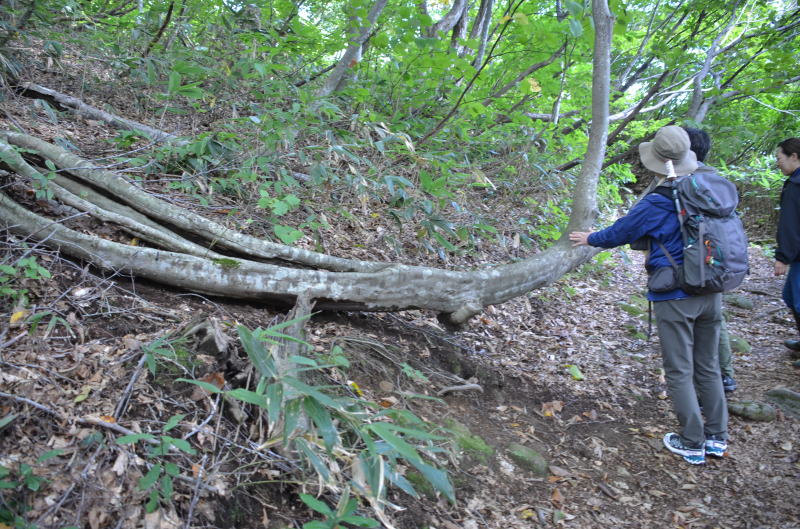雪の重みてで斜面沿いに曲がり上に育つ |